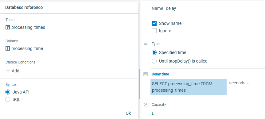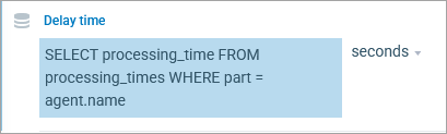 Now, we can configure our Delay block to retrieve the necessary processing time for each part type from the database table.