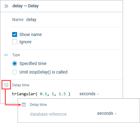 For the Delay time property, witch from the value editor to the database reference constructor. To do this, click the