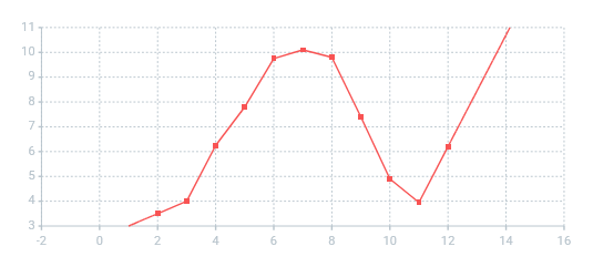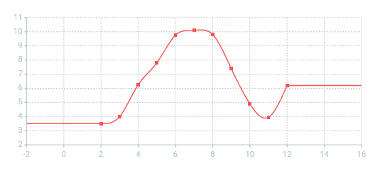 - Spline — Points are connected with 4th-order polynomial segments. For each point, the 0th, 1st, and 2nd derivatives of the right and left segments are equal. The 2nd derivative at the end points equals zero.