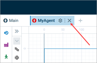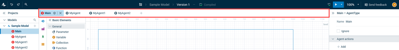 When you open a model, the Main tab is open and active by default. A new tab opens automatically for every new agent type created. To open a tab for an already existing agent type, select one of your agent types from the model's project tree. You can sort the tabs in the component bar by dragging them.