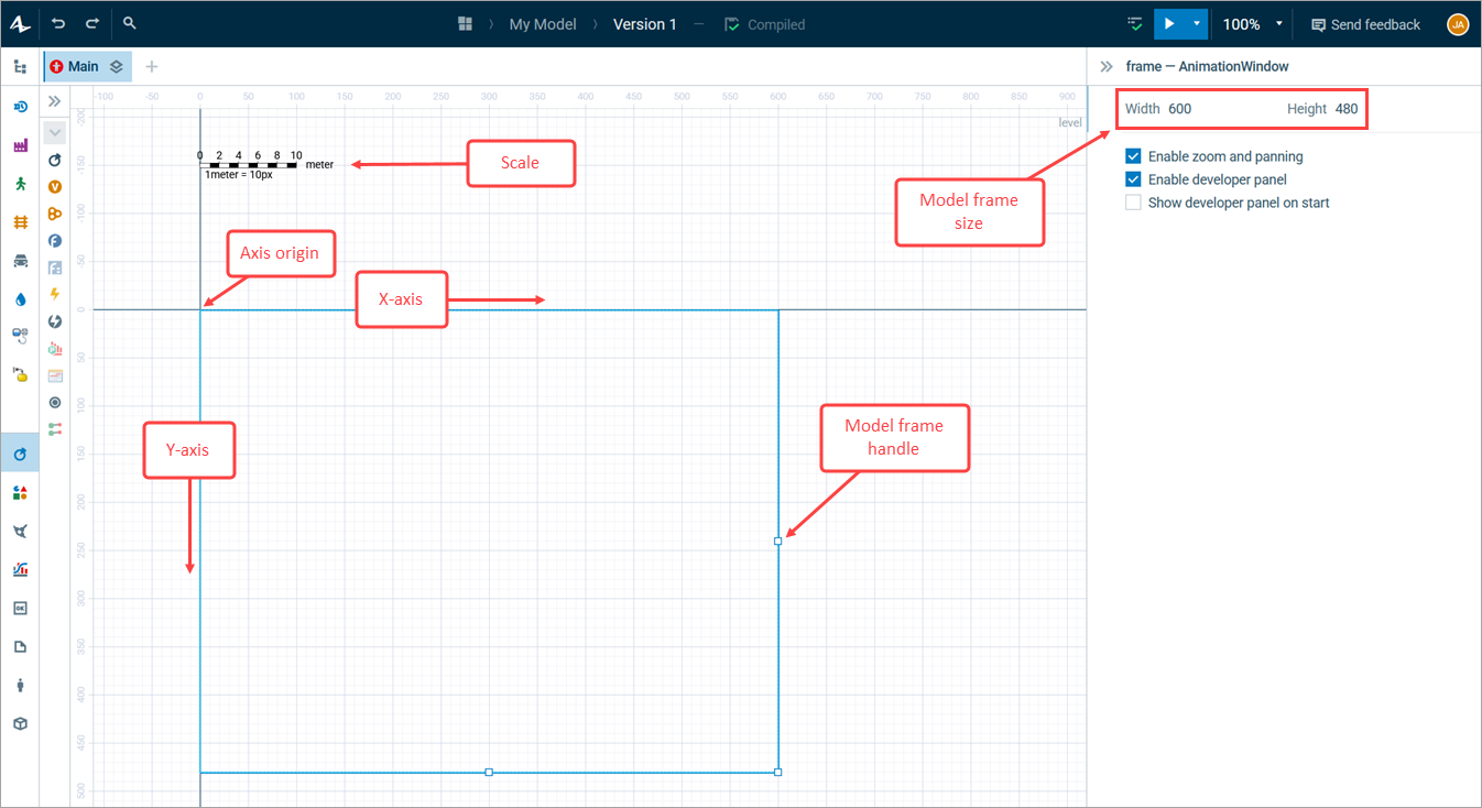 To change the frame size, select it in the graphical editor and drag its handles. Alternatively, you can set the size of the frame by specifying the Width and Height in its properties. The top left corner of the model frame is always at the axis origin (0, 0).