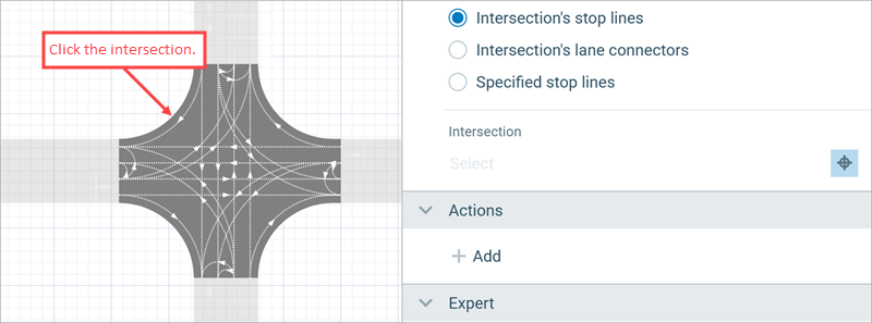 Specify the intersection that is controlled by this Traffic Light block. In the traffic light properties, click the