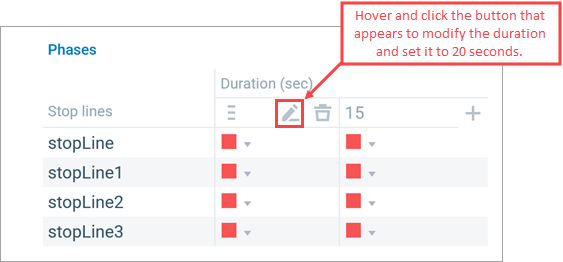 In the Phases table, set its duration to 20 second. Then, configure the colors for the other two stop lines located on the vertical road.