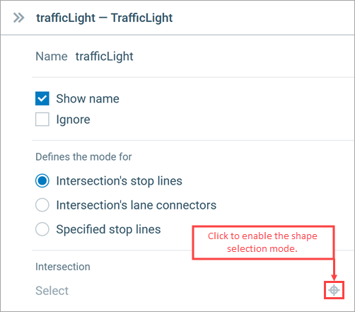 - This activates the shape selection mode. In the graphical editor, you will see that all shapes except the intersections are grayed out. Click on the intersection that will be controlled by this Traffic Light block.