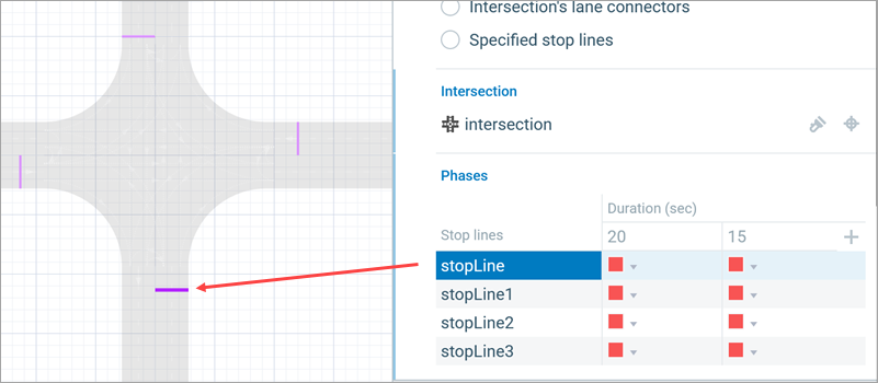 Each road that connects to the intersection requires a stop line on the lane that is moving towards the intersection. After specifying the intersection in the Traffic Light properties, all stop lines of this intersection will be listed in the Phases table below. Define the red, green, and, optionally, yellow phase durations for each stop line of the selected intersection. Let’s set up the traffic light phases step by step.