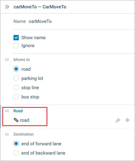 Modify the properties of the carMoveTo block. Leave the default Moves to: road setting and again select