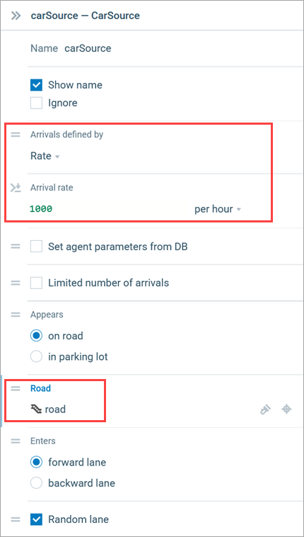 Select the carSource block. In the Properties view, specify how often cars arrive. In the Road drop-down list, select