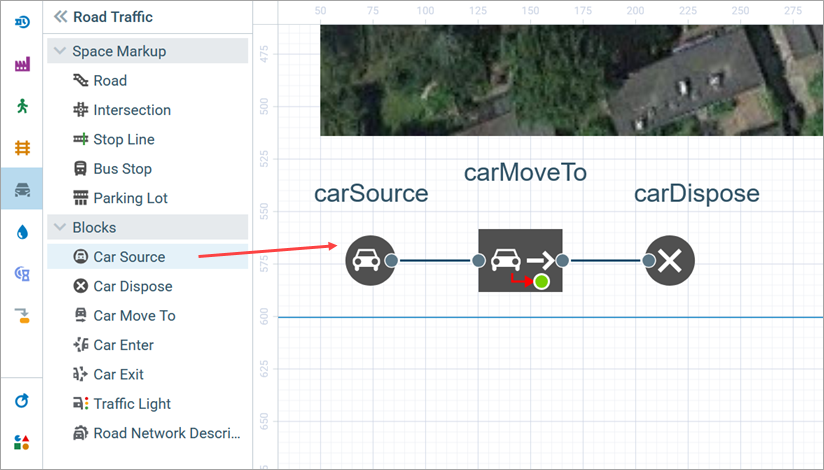 road, it should have the name of the road we have previously drawn. This way we tell this carSource block to place generated cars on this particular road.