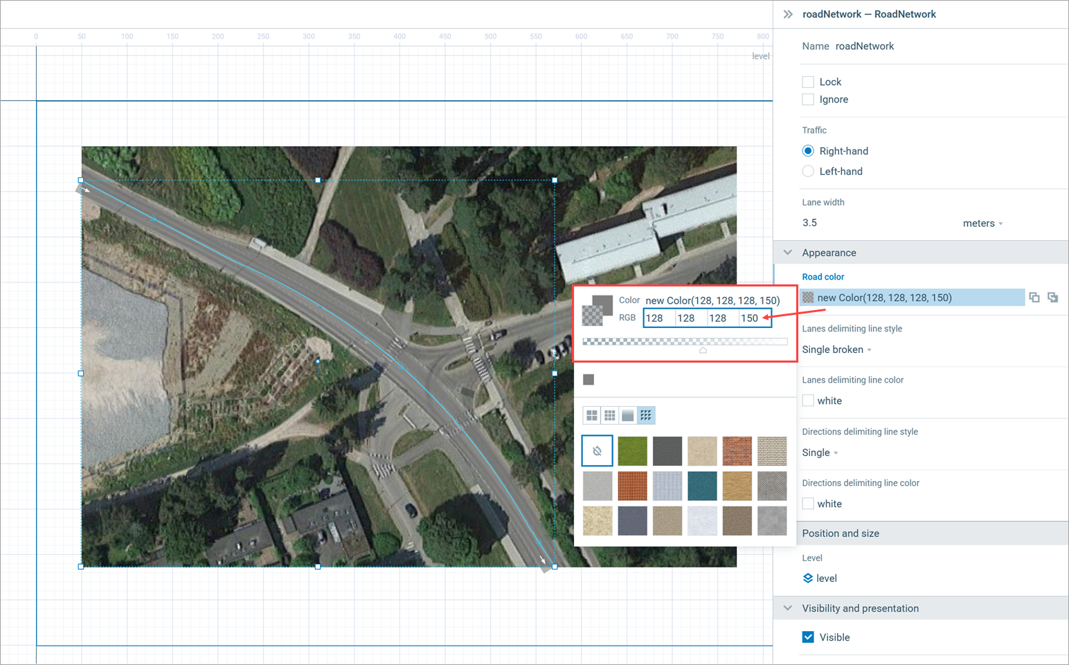 Select the road network by single-clicking the road twice: the first click selects the road itself, the next one selects the road network. Having selected the road network, open the network’s Appearance properties. Click the Road color control and drag the transparency slider or reduce the Opacity in the fourth field of the RGB setting. Here we will set the opacity to 150.