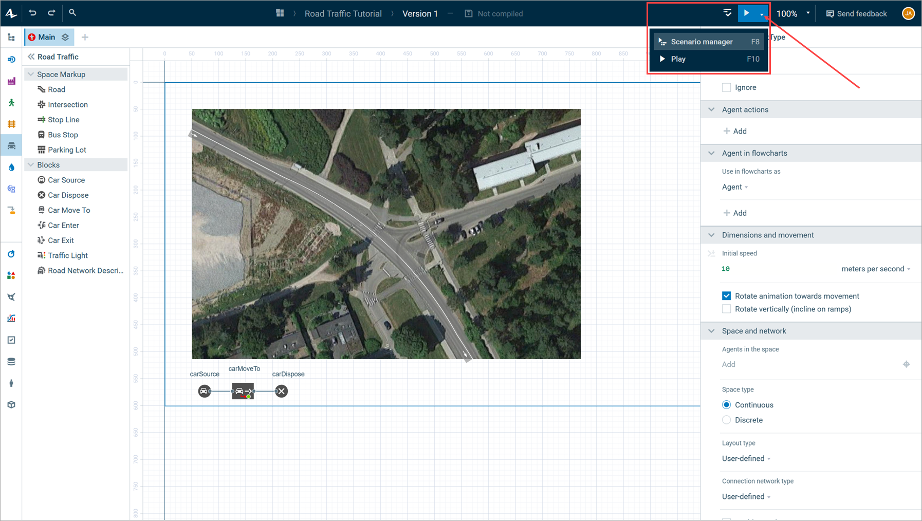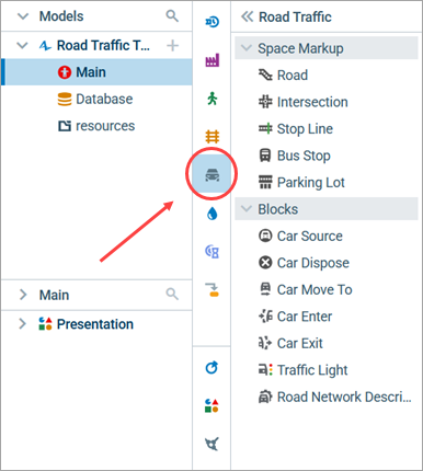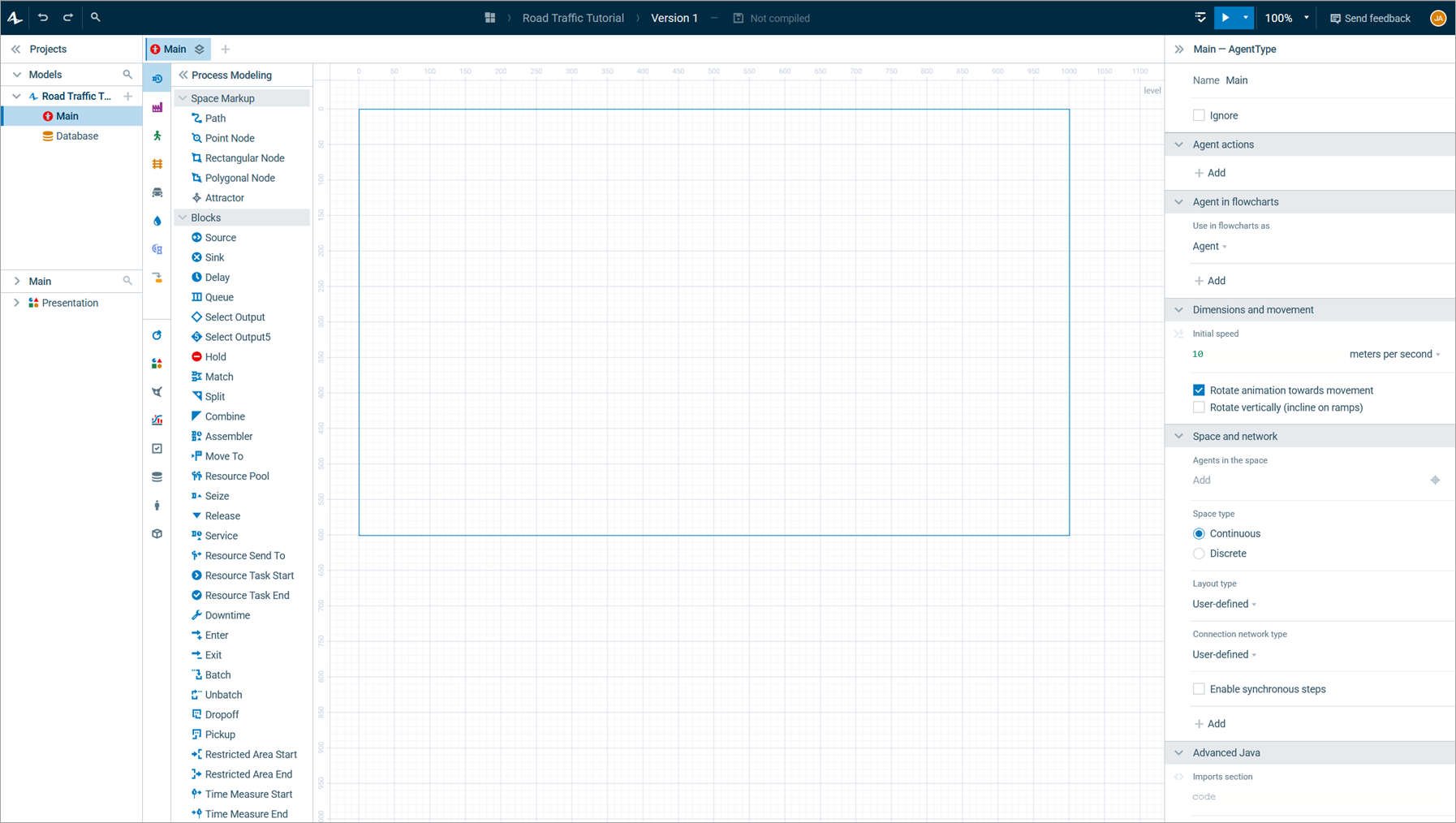 The new model already has one agent type called Main. Agents are the main building blocks in AnyLogic models. In our case, the Main agent will serve as the space where we will define the entire model logic: we will draw a road network and define the traffic flow using a flowchart.
