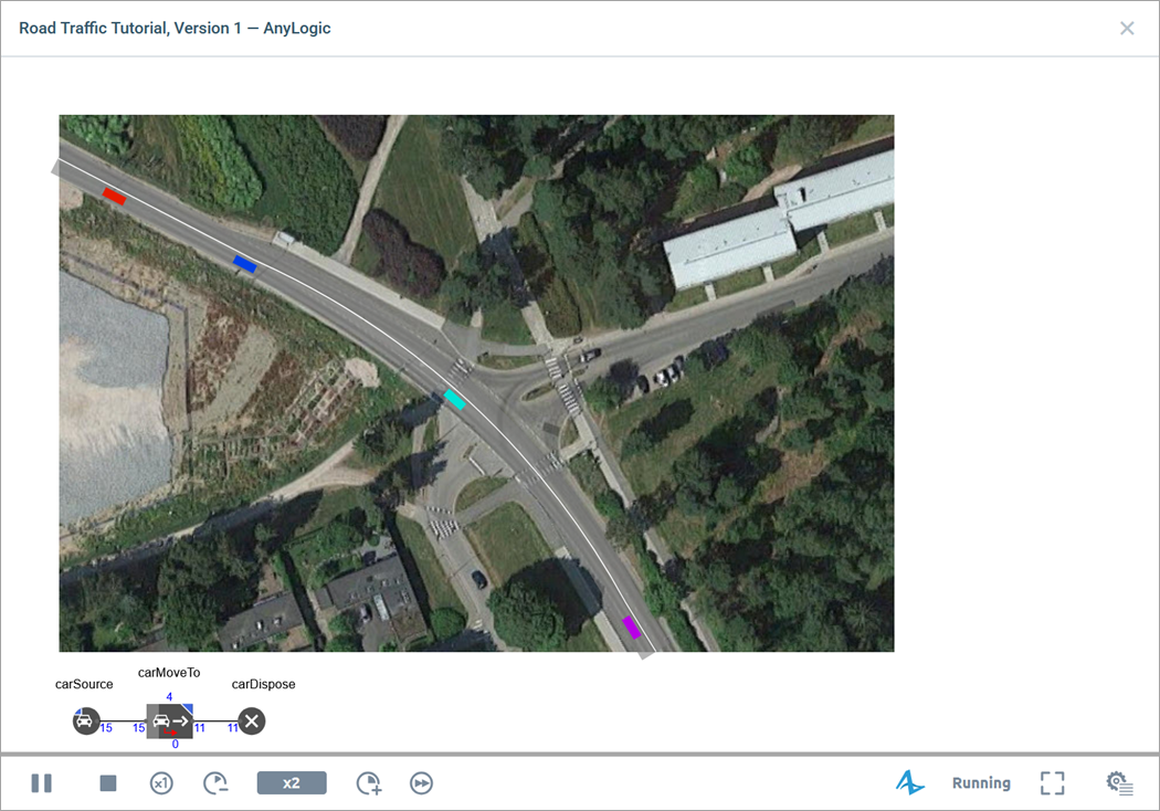 On starting the model, you will see the model window. It displays the presentation of the top-level agent type (by default, it’s Main). Observe the process dynamics. You will see a 2D animation with cars moving over the layout image. If needed, adjust the execution speed using Slow down and