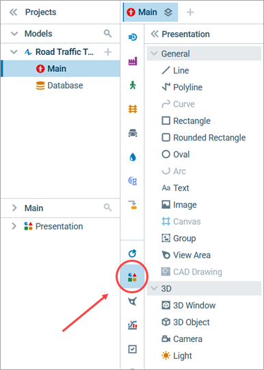 First, find the Presentation palette in the Palette view. This palette contains shapes which you can use in your presentation. To open a palette, click on the corresponding icon in the vertical ribbon docked to the left side of the palette. You can toggle the expanded view with the names for all the palettes and elements by clicking . To return to the minimized view, click .