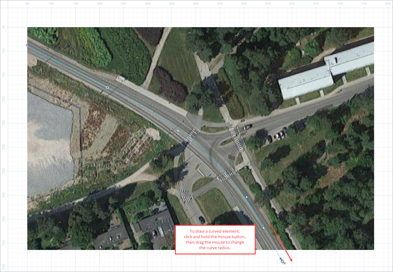The next segment of our road is curved. To draw a curved segment, press the left mouse button at the road’s next turning point (at the beginning of the next linear segment) and, with the left mouse button being pressed, move the mouse until you get the required shape. Release the mouse button when you are finished adjusting the shape.