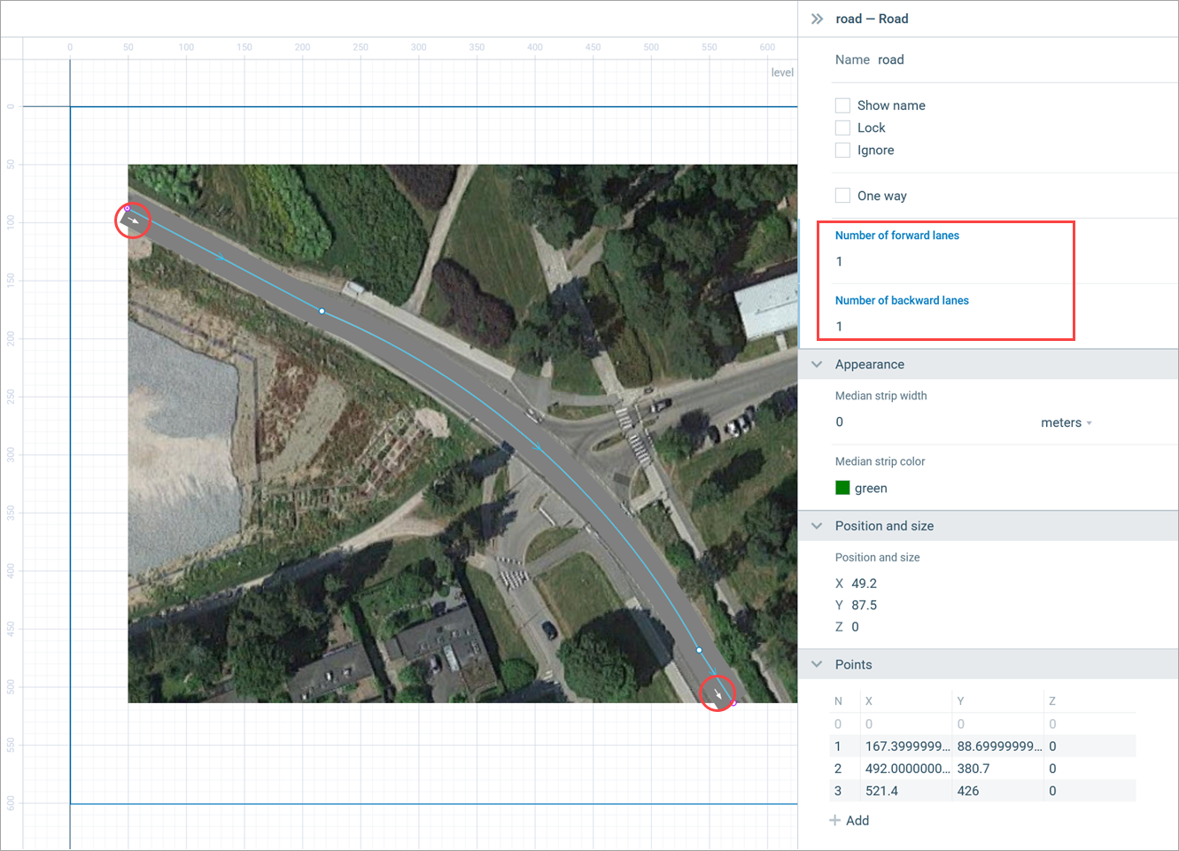 As you can see, the road is drawn opaque. You can make it semi-transparent to double-check whether the resulting road perfectly matches the road on the map. The transparency setting (as well as traffic direction and lane width) is defined not in the road properties, but in the properties of the road network this road belongs to.