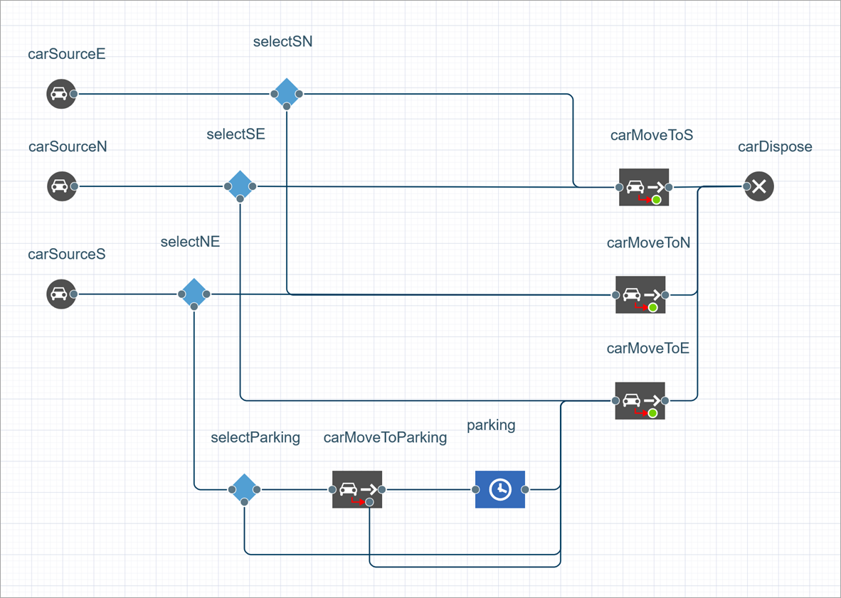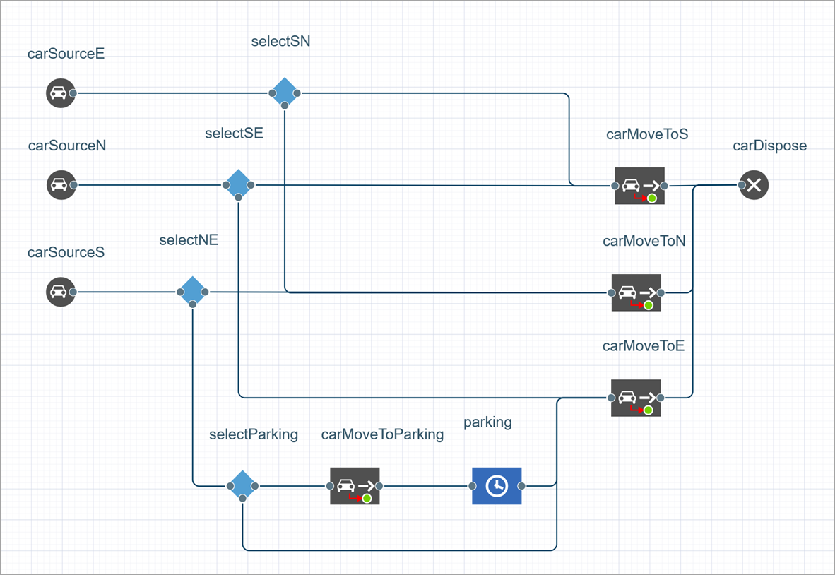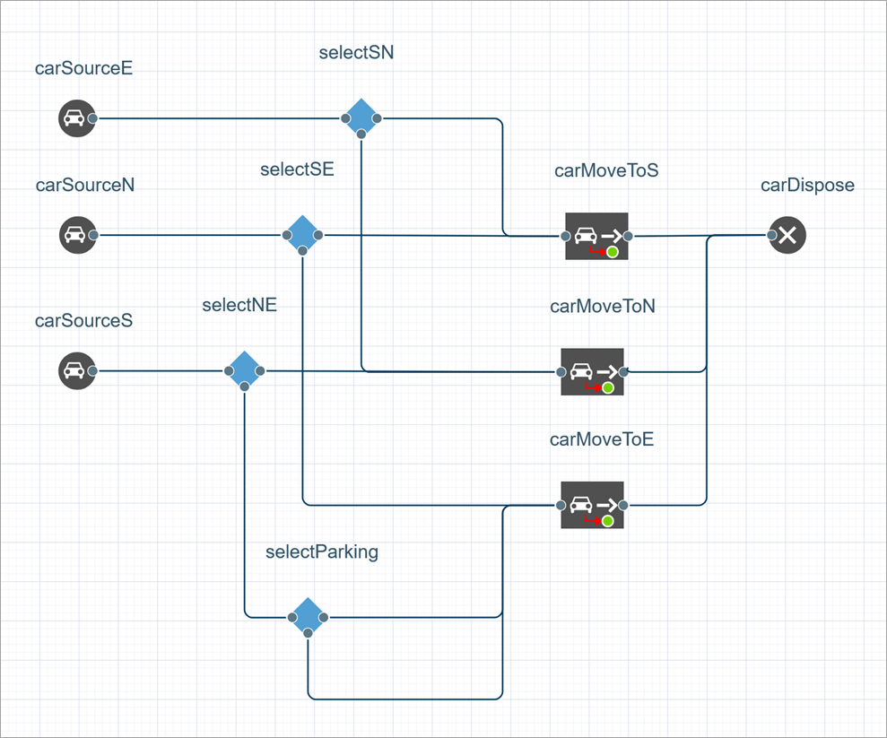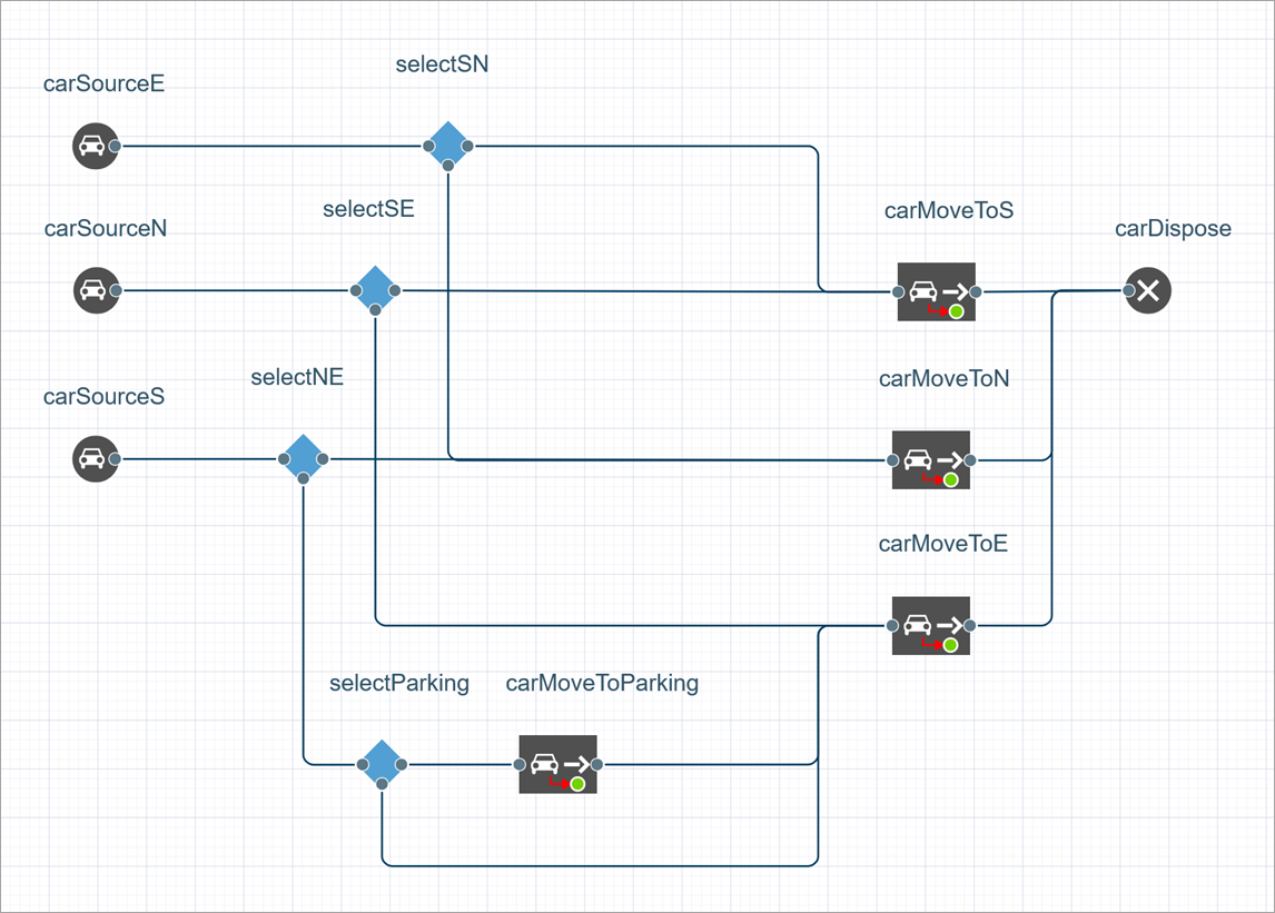 Car Move To block to the process branch of the selectParking block’s upper output port (see figure below). Name it carMoveToParking. This block will model the behavior of cars that should drive to the parking lot.