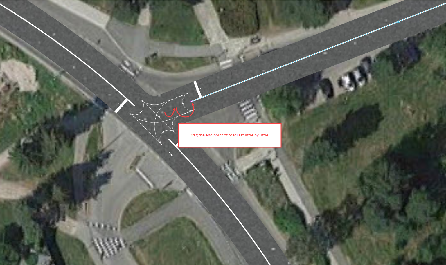 roadEast road in the graphical editor. Its end points will be highlighted. Using the layout as a reference, move the end point connected to the intersection in small steps. If you move it too far at once, it may disconnect from the intersection. If this happens, press the Undo button on the top toolbar.