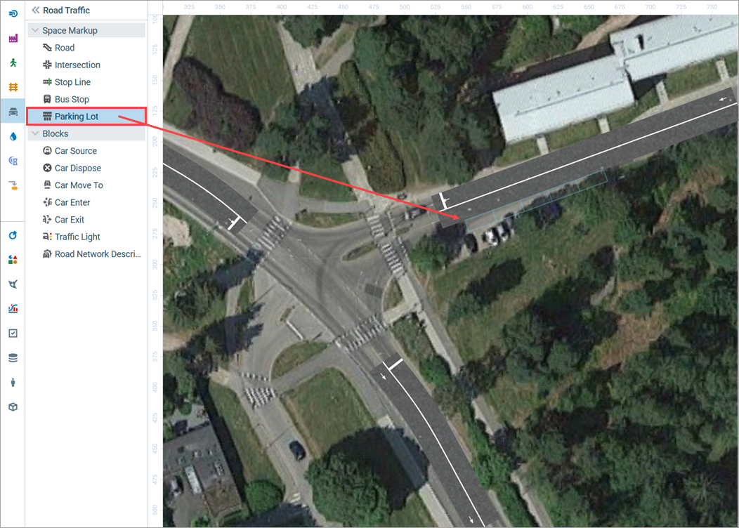 Parking Lot element from the Space Markup section of the Road Traffic Library palette to the graphical diagram. All elements except for the roads will be temporarily hidden. Drop the Parking Lot at the side of Menninkäisentie (roadEast) just where the parked cars are on the layout. The parking lot will connect to the road. You can change the parking lot’s location if needed by dragging it to the proper location.