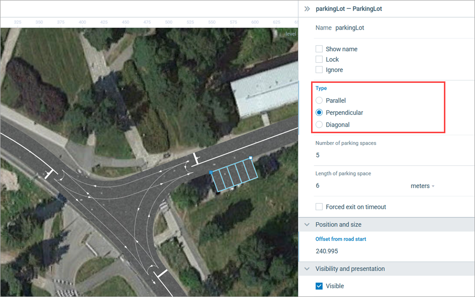 Switch to the Properties view and set the Type of the parking lot to Perpendicular. It should look like this now: