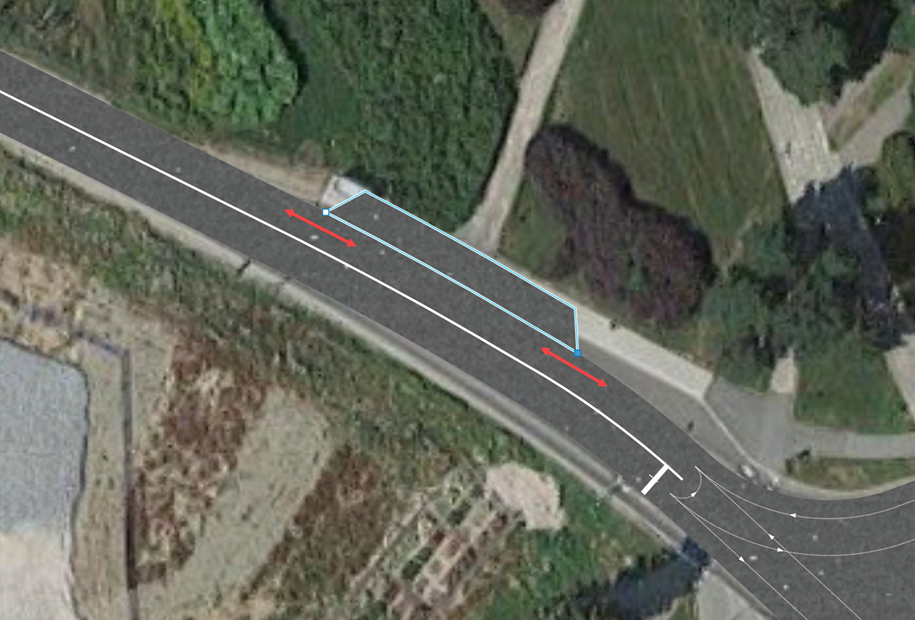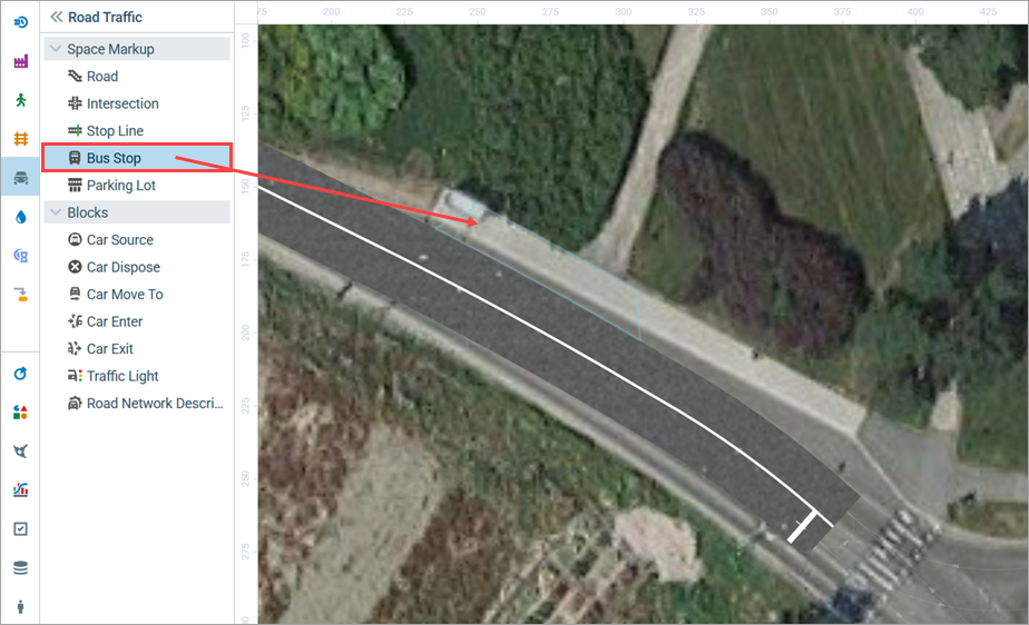 Bus Stop element from the Space Markup section of the Road Traffic Library palette to the graphical editor. Place it at the roadside as shown in the figure below: the outline of the bus stop is shown in pale blue.