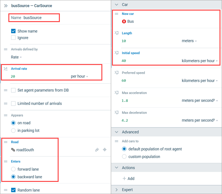 Car Source blocks we created earlier, this one should generate buses, not cars. Open the Car section of the block’s properties and create a new agent type: click the New car field and select Create new agent in the context menu.
