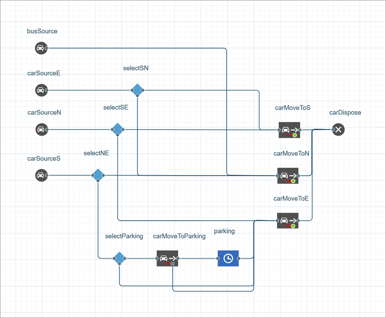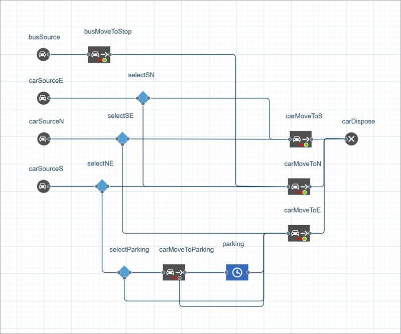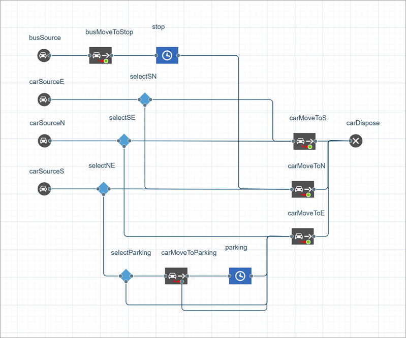 Car Move To block to the busSource block’s flowchart branch (see figure below). Name it busMoveToStop. It will make the bus go to the bus stop.