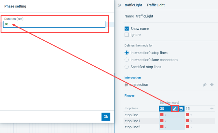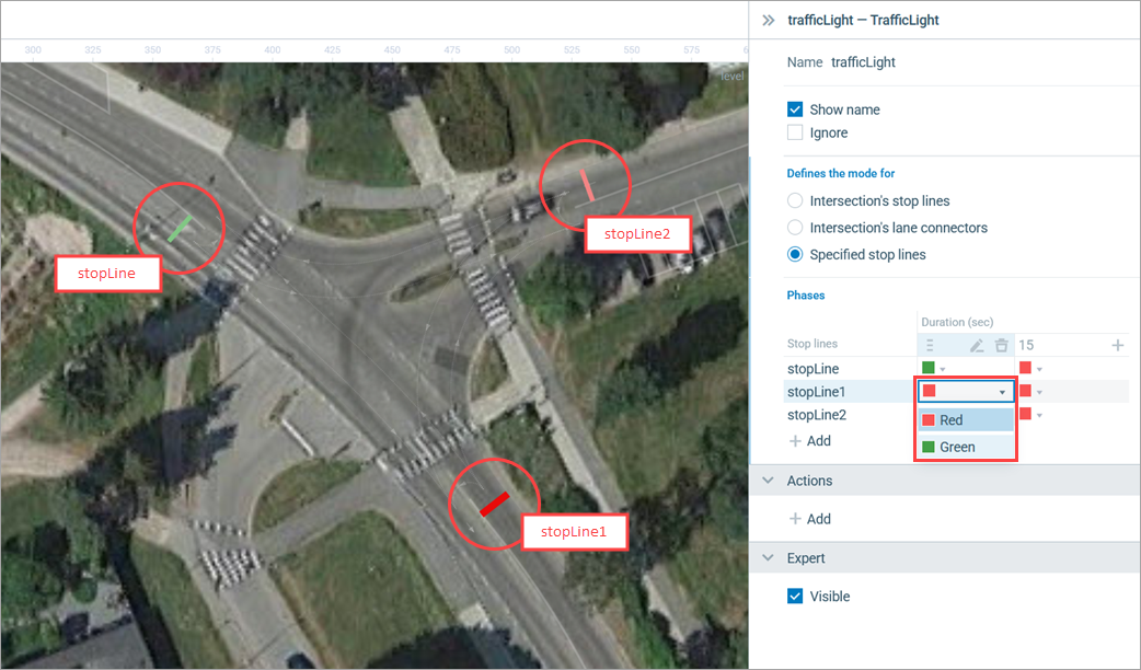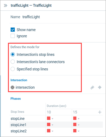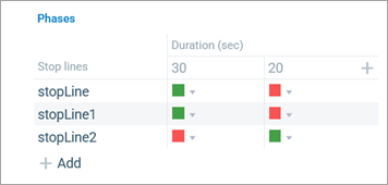 - Once you have specified the intersection in a traffic light’s properties, all its stop lines will be listed in the Phases table below. Here you define the red, green, and, optionally, yellow light phase duration for every stop line of the selected intersection.