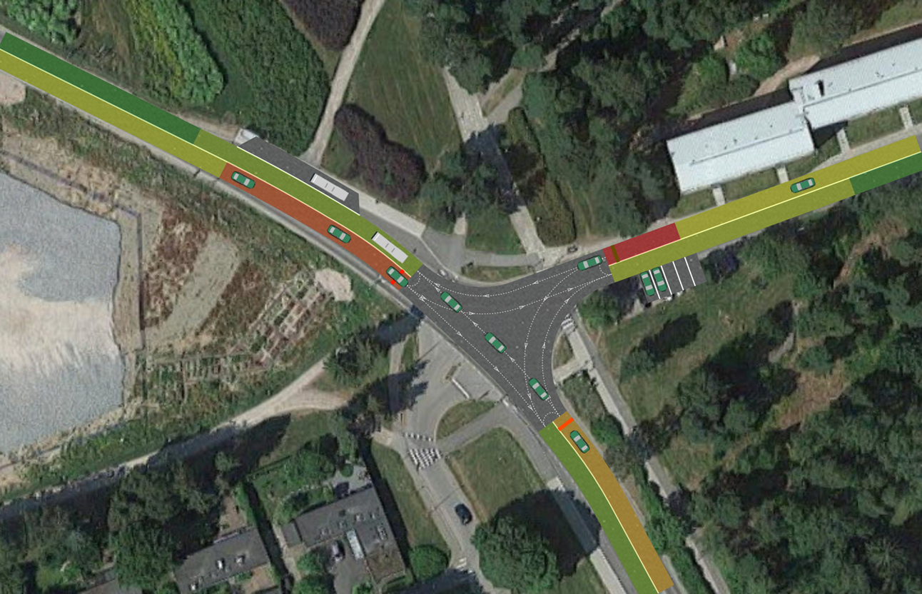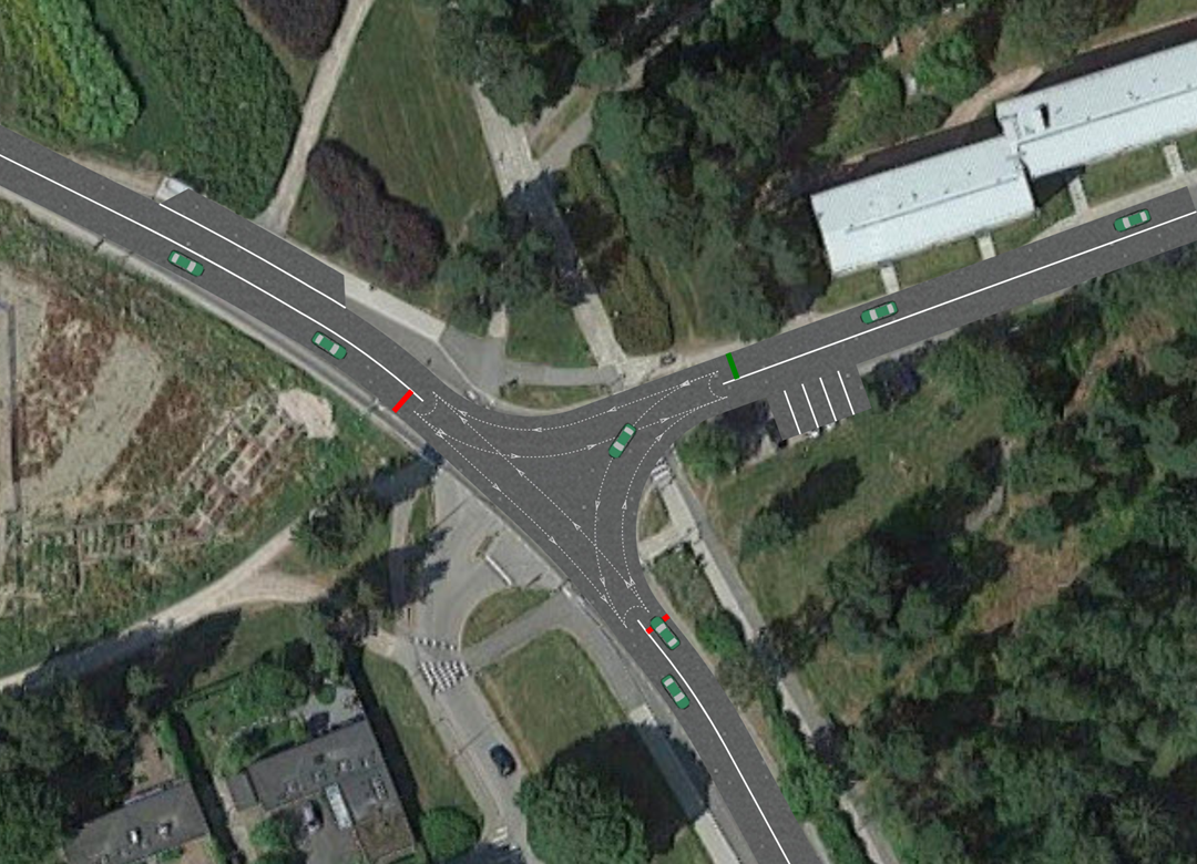 Run the model. You will see the traffic light phases change, allowing traffic flow either on the main road, Tapiolavägen, or on the adjacent Menninkäisentie.