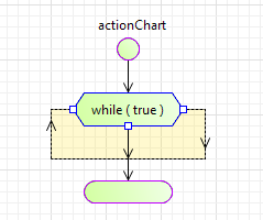 In “while loop” you define some action or a sequence of actions using other action chart blocks. These actions are executed if the condition defined for this loop evaluates to true. The condition is evaluated once at the beginning of the loop and again before each further iteration of the action.