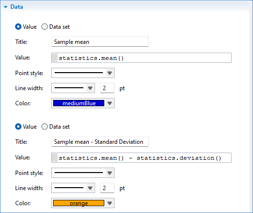 Since the functions return scalar values, you must select the Value option to visualize them. The statistics element in this model is named statistics, so you call its functions in the Value field as statistics.mean(), statistics.mean() - statistics.deviation(), and so on.