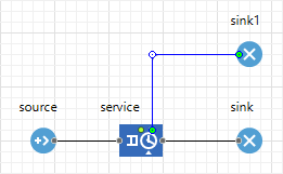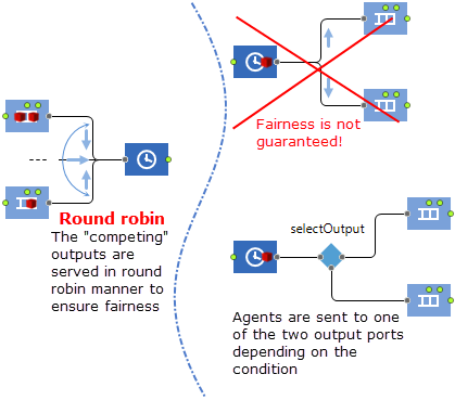 If one output port is connected to several input ports, it will choose the “first in some internal queue” port among those that are ready to accept the agent. More precisely, the output port will rely on the choice of AnyLogic engine among several simultaneous events. Fairness is not guaranteed in this case and such connection is therefore prohibited: it will cause an error at model runtime. To have full control over the agent distribution, use the SelectOutput blocks or custom agent routing implemented via blocks that take agents out of the process flow or put them into the flowchart. See the list of library specific blocks below: