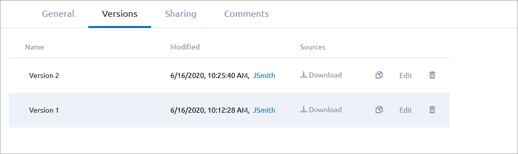 - Modified — The date and time the version was last modified. Also includes the clickable name of the user who made the changes, which links to their profile.